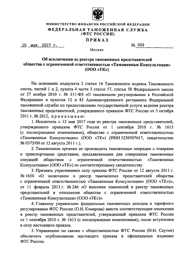 ПРИКАЗ ФТС РФ от 19.05.2017 N 839