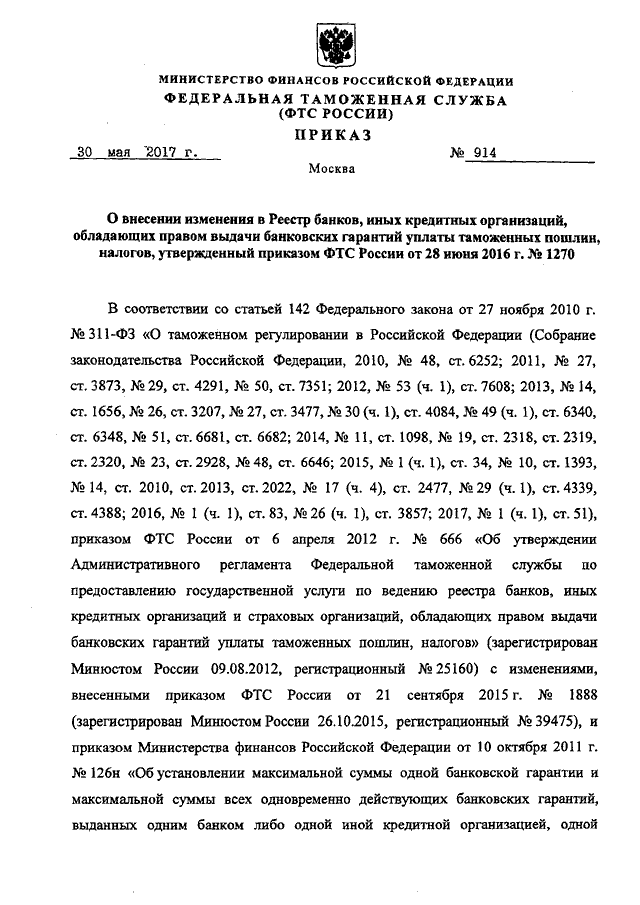 ПРИКАЗ ФТС РФ от 30.05.2017 N 914