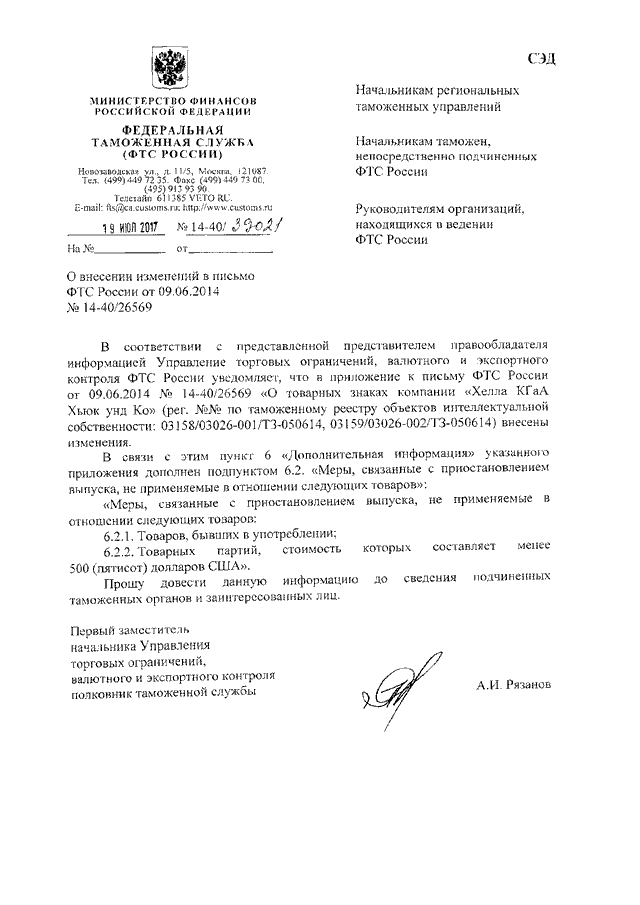 "О ВНЕСЕНИИ ИЗМЕНЕНИЙ В ПИСЬМО ФТС РОССИИ ОТ 09.06.2014 N 14-40/26569"