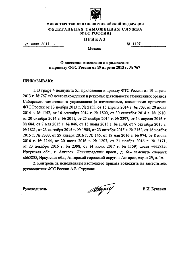 ПРИКАЗ ФТС РФ от 21.07.2017 N 1197