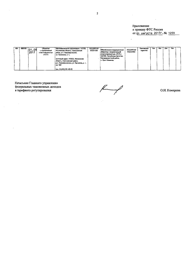 ПРИКАЗ ФТС РФ от 01.08.2017 N 1259