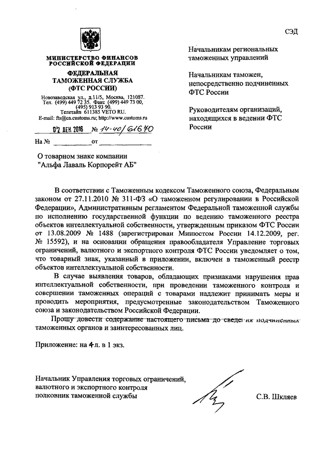 ПИСЬМО ФТС РФ от 02.12.2016 N 14-40/61670