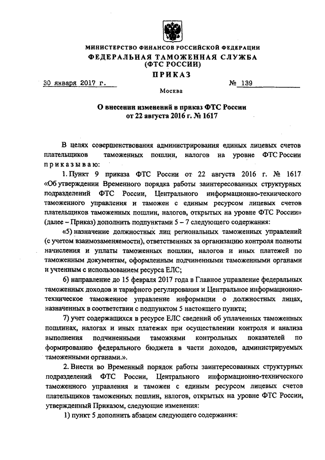ПРИКАЗ ФТС РФ от 30.01.2017 N 139