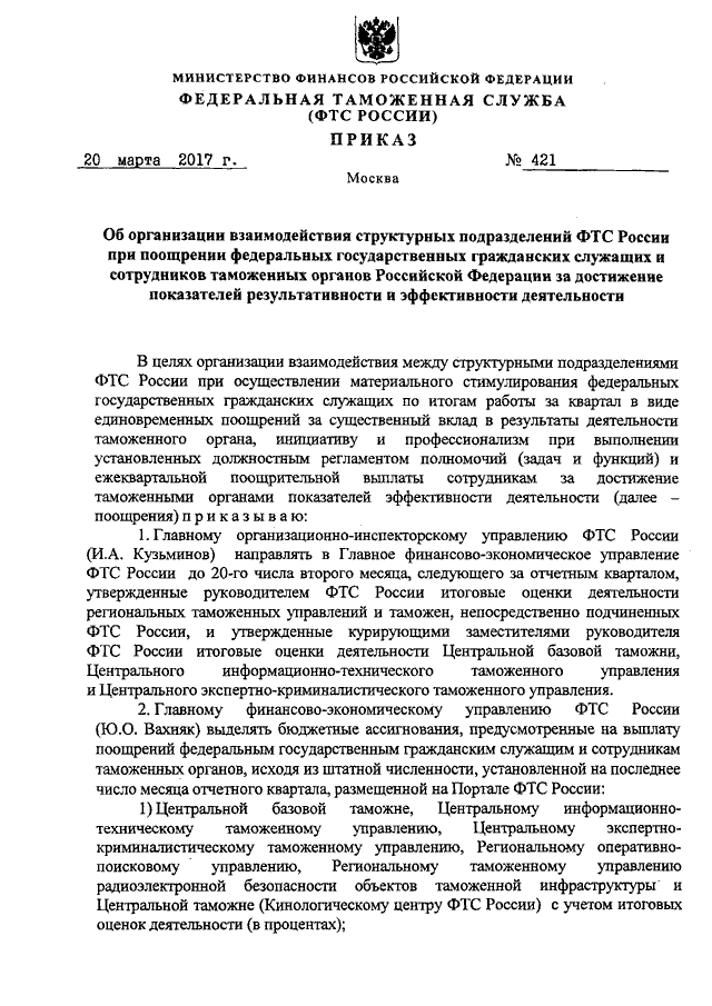 ПРИКАЗ ФТС РФ от 20.03.2017 N 421 "ОБ ОРГАНИЗАЦИИ ВЗАИМОДЕЙСТВИЯ СТРУКТУРНЫХ ПОДРАЗДЕЛЕНИЙ ФТС