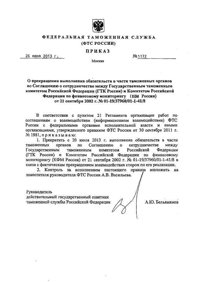 ПРИКАЗ ФТС РФ от 26.06.2013 N 1172 "О ПРЕВРАЩЕНИИ ВЫПОЛНЕНИЯ ОБЯЗАТЕЛЬСТВ В ЧАСТИ ТАМОЖЕННЫХ ОРГАНОВ