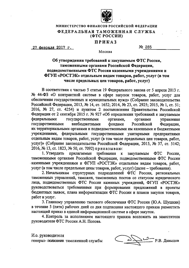 ПРИКАЗ ФТС РФ от 27.02.2017 N 285