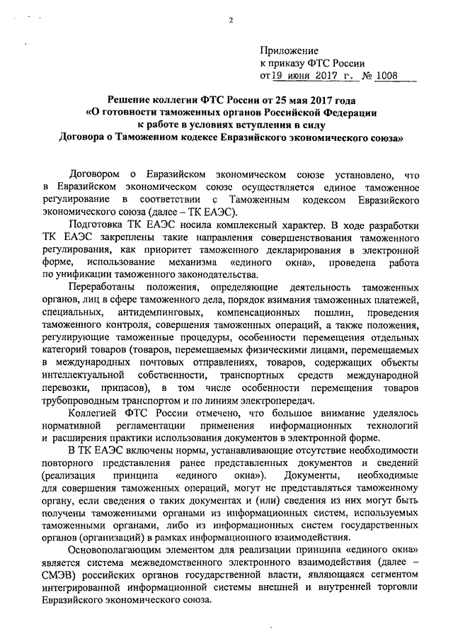 ПРИКАЗ ФТС РФ от 19.06.2017 N 1008
