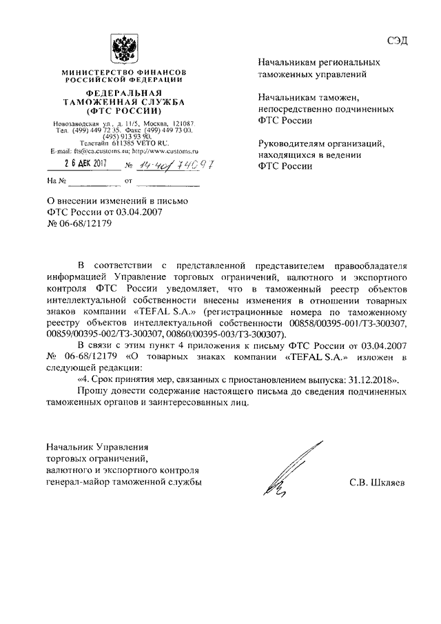 ПИСЬМО ФТС РФ от 26.12.2017 N 14-40/74097