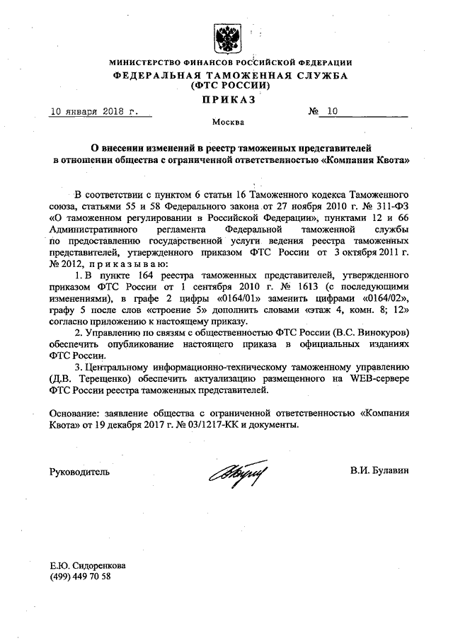 ПРИКАЗ ФТС РФ от 10.01.2018 N 10