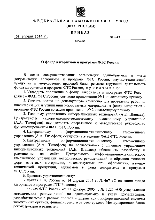 ПРИКАЗ ФТС РФ от 07.04.2014 N 643