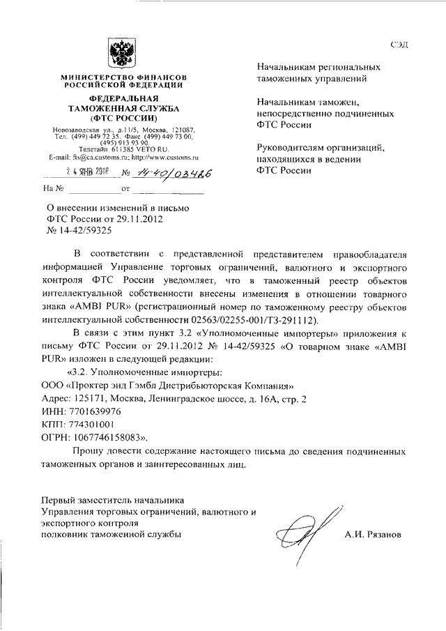 ПИСЬМО ФТС РФ от 24.01.2018 N 14-40/03426