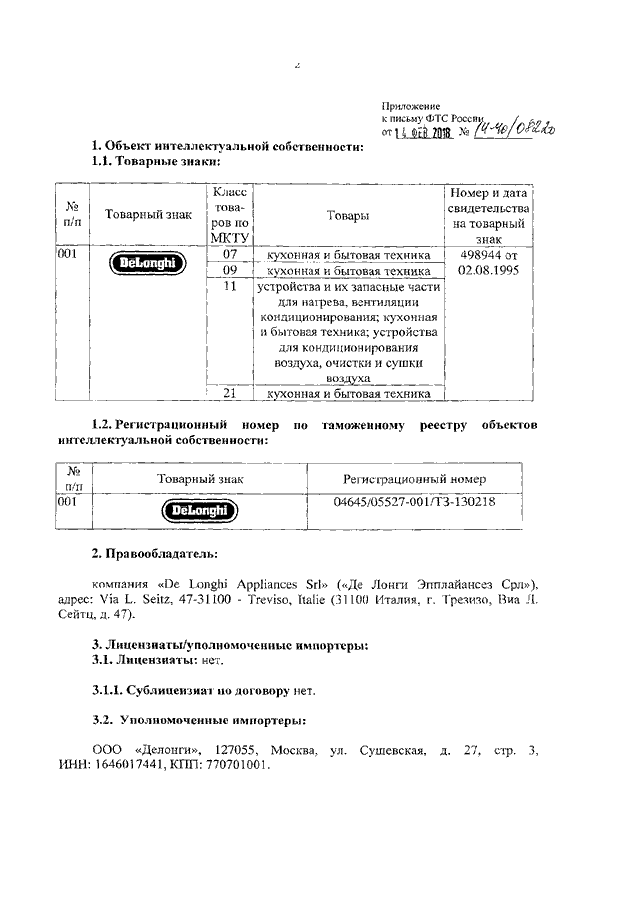 "О ТОВАРНОМ ЗНАКЕ "DE'LONGHI"
