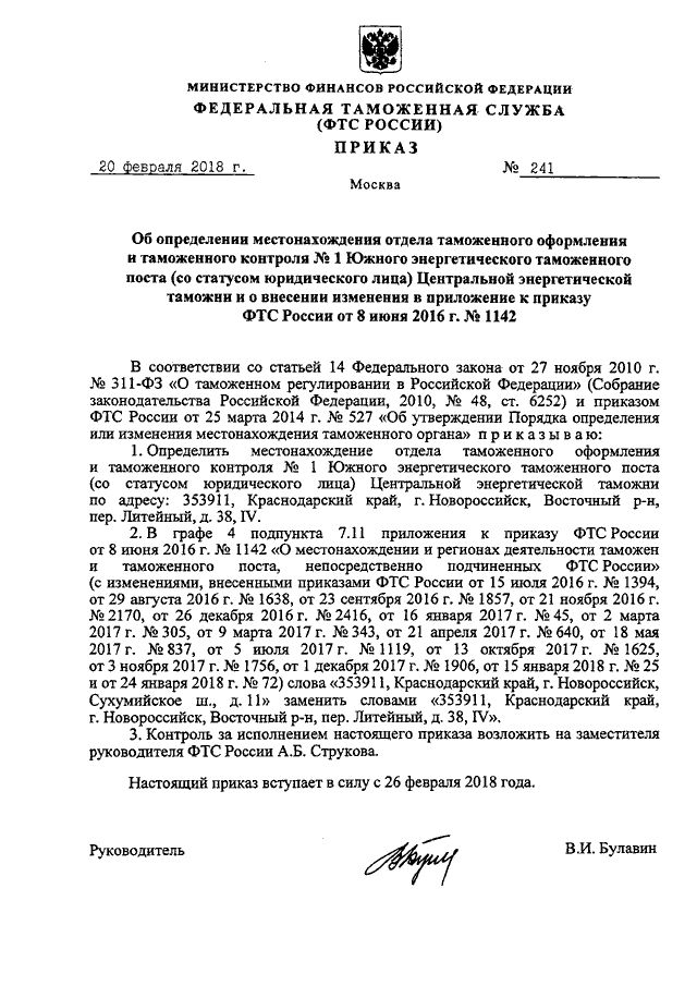 ПРИКАЗ ФТС РФ от 20.02.2018 N 241 "ОБ ОПРЕДЕЛЕНИИ МЕСТОНАХОЖДЕНИЯ ОТДЕЛА ТАМОЖЕННОГО ОФОРМЛЕНИЯ И