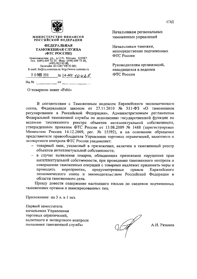 ПИСЬМО ФТС РФ от 26.02.2018 N 14-40/10425