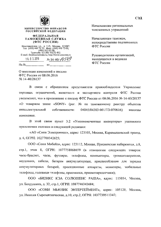 "О ВНЕСЕНИИ ИЗМЕНЕНИЙ В ПИСЬМО ФТС РОССИИ ОТ 08.06.2016 N 14-40/28137"