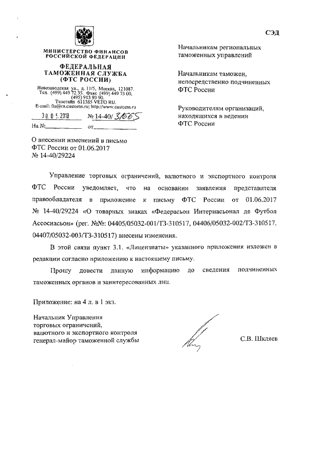 "О ВНЕСЕНИИ ИЗМЕНЕНИЙ В ПИСЬМО ФТС РОССИИ ОТ 01.06.2017 N 14-40/29224"