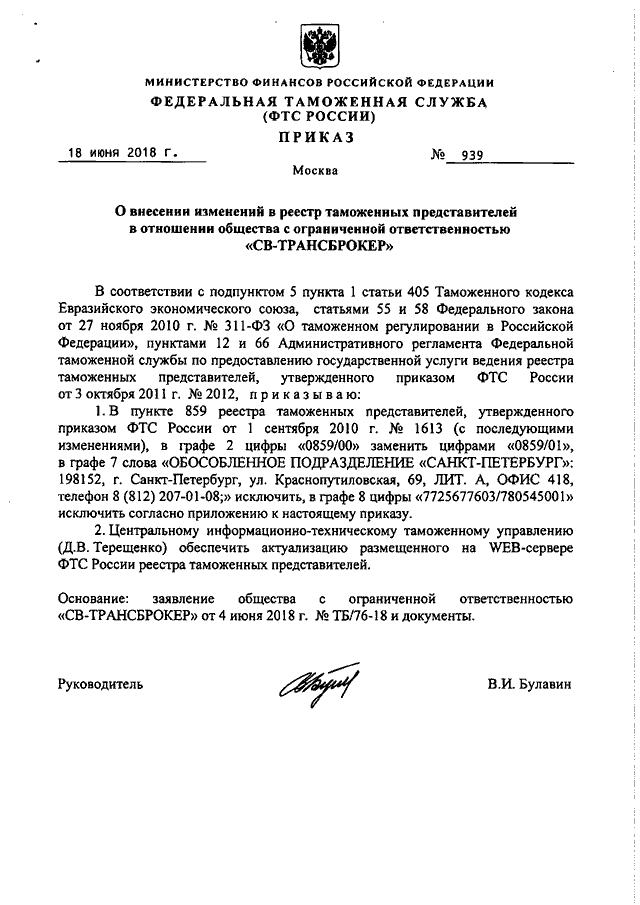 "О ВНЕСЕНИИ ИЗМЕНЕНИЙ В РЕЕСТР ТАМОЖЕННЫХ ПРЕДСТАВИТЕЛЕЙ В ОТНОШЕНИИ ОБЩЕСТВА С ОГРАНИЧЕННОЙ ОТВЕТСТВЕННОСТЬЮ "СВ-ТРАНСБРОКЕР"