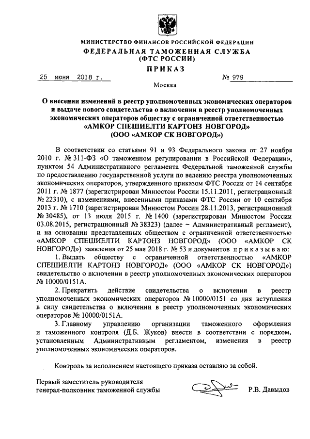 ПРИКАЗ ФТС РФ от 25.06.2018 N 979 "О ВНЕСЕНИИ ИЗМЕНЕНИЙ В РЕЕСТР УПОЛНОМОЧЕННЫХ ЭКОНОМИЧЕСКИХ
