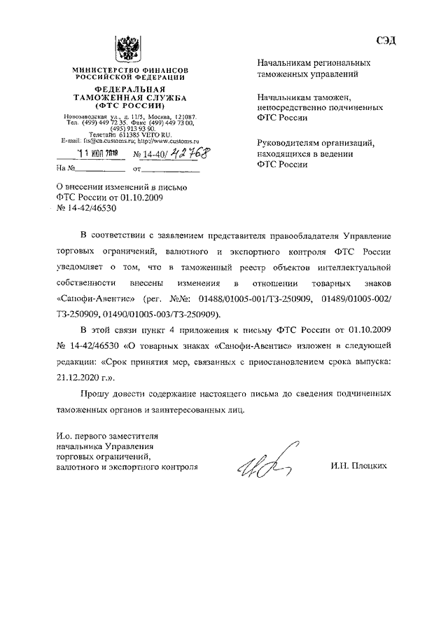 "О ВНЕСЕНИИ ИЗМЕНЕНИЙ В ПИСЬМО ФТС РОССИИ ОТ 01.10.2009 N 14-42/46530"