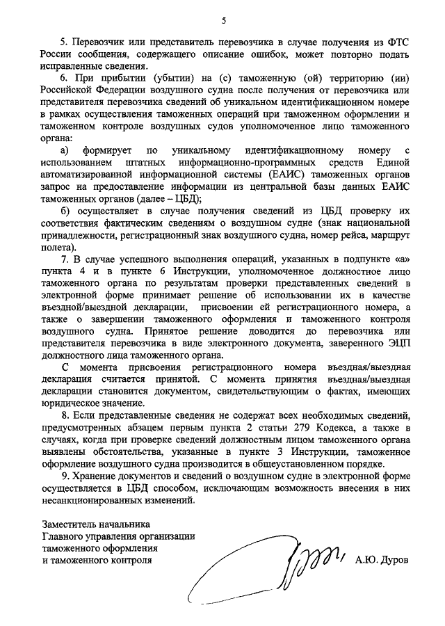 "ОБ УТВЕРЖДЕНИИ ИНСТРУКЦИИ ОБ ОСОБЕННОСТЯХ СОВЕРШЕНИЯ ДОЛЖНОСТНЫМИ ЛИЦАМИ ТАМОЖЕННЫХ ОРГАНОВ ТАМОЖЕННЫХ ОПЕРАЦИЙ ПРИ ТАМОЖЕННОМ ОФОРМЛЕНИИ И ТАМОЖЕННОМ КОНТРОЛЕ ВОЗДУШНЫХ СУДОВ, ИСПОЛЬЗУЕМЫХ ДЛЯ МЕЖДУНАРОДНЫХ ПЕРЕВОЗОК ТОВАРОВ И ПАССАЖИРОВ, ПРИ ПРЕДСТАВЛЕНИИ ПЕРЕВОЗЧИКОМ ДОКУМЕНТОВ И СВЕДЕНИЙ В ЭЛЕКТРОННОЙ ФОРМЕ"