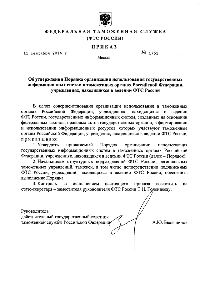 ПРИКАЗ ФТС РФ от 11.09.2014 N 1751