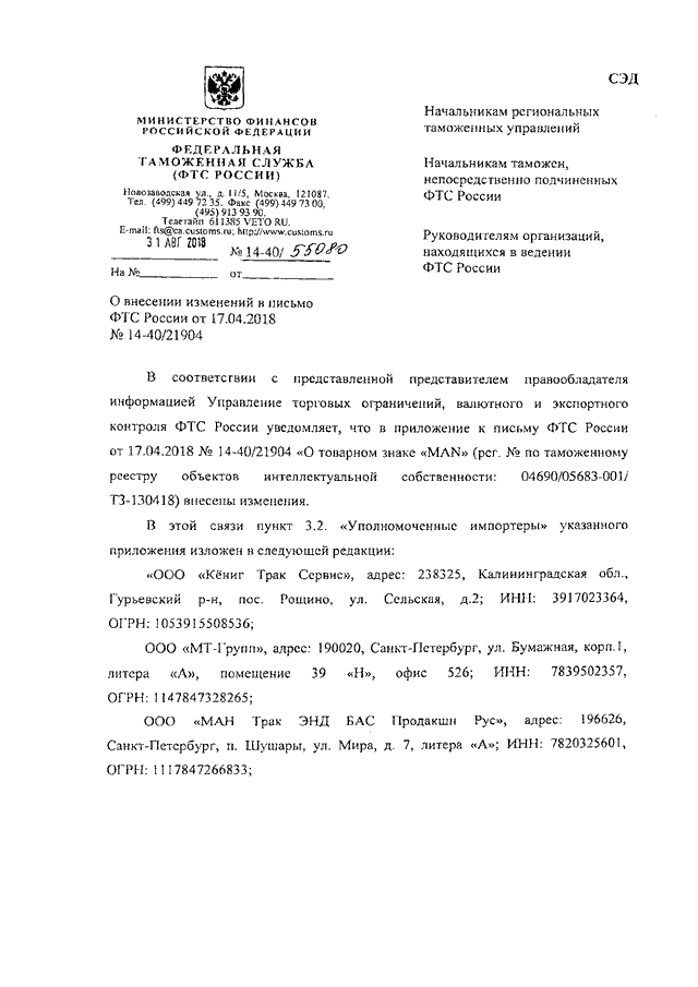 "О ВНЕСЕНИИ ИЗМЕНЕНИЙ В ПИСЬМО ФТС РОССИИ ОТ 17.04.2018 N 14-40/21904"