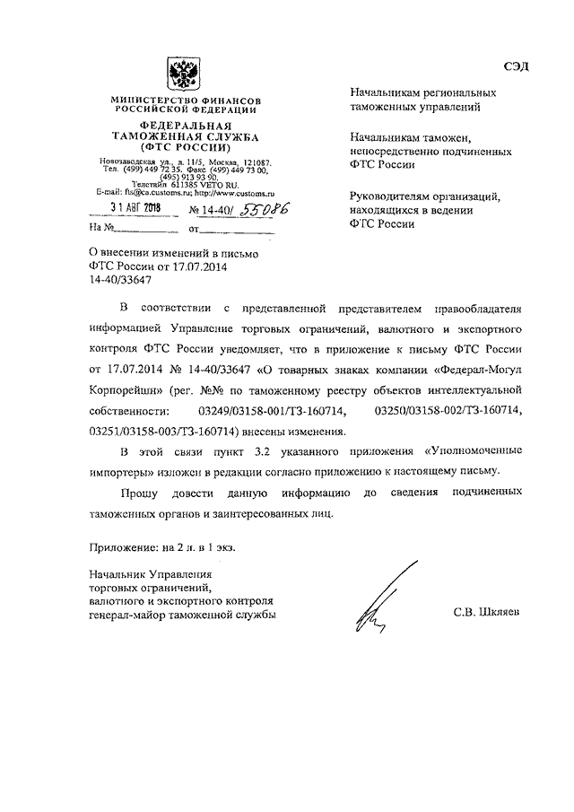 ПИСЬМО ФТС РФ от 31.08.2018 N 14-40/55086