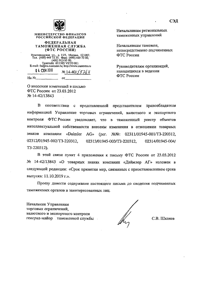 ПИСЬМО ФТС РФ от 04.09.2018 N 14-40/55764
