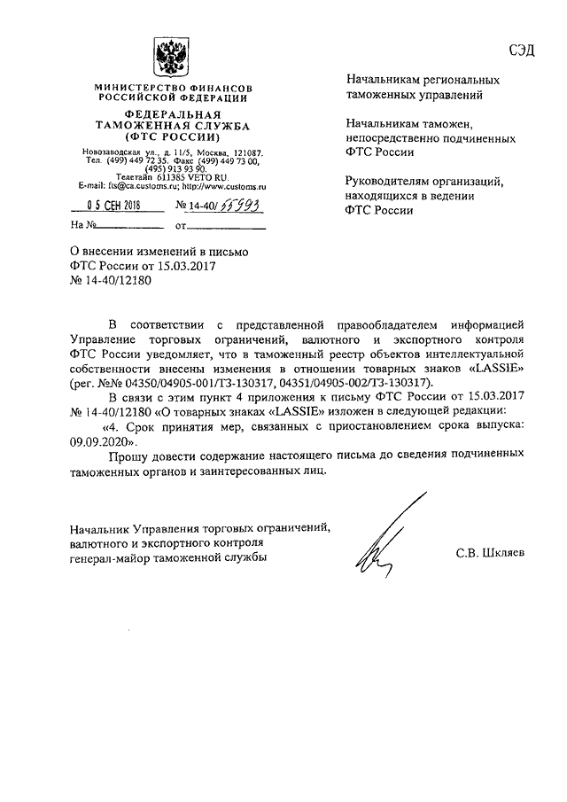 "О ВНЕСЕНИИ ИЗМЕНЕНИЙ В ПИСЬМО ФТС РОССИИ ОТ 15.03.2017 N 14-40/12180"