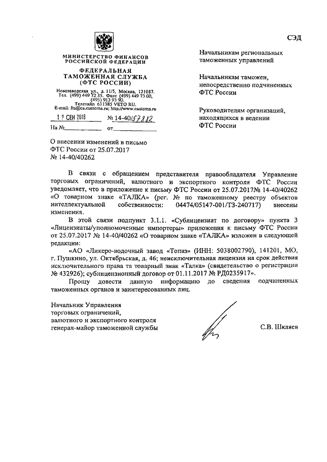 "О ВНЕСЕНИИ ИЗМЕНЕНИЙ В ПИСЬМО ФТС РОССИИ ОТ 25.07.2017 N 14-40/40262"