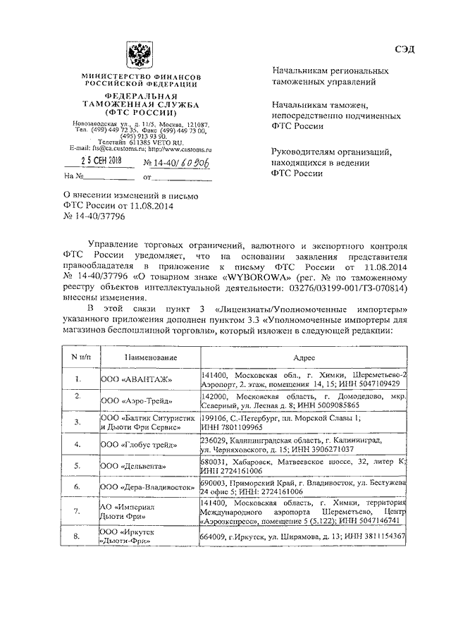 "О ВНЕСЕНИИ ИЗМЕНЕНИЙ В ПИСЬМО ФТС РОССИИ ОТ 11.08.2014 N 14-40/37796"