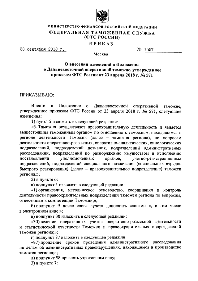 "О ВНЕСЕНИИ ИЗМЕНЕНИЙ В ПОЛОЖЕНИЕ О ДАЛЬНЕВОСТОЧНОЙ ОПЕРАТИВНОЙ ТАМОЖНЕ, УТВЕРЖДЕННОЕ ПРИКАЗОМ ФТС РОССИИ ОТ 23 АПРЕЛЯ 2018 Г. N 571"