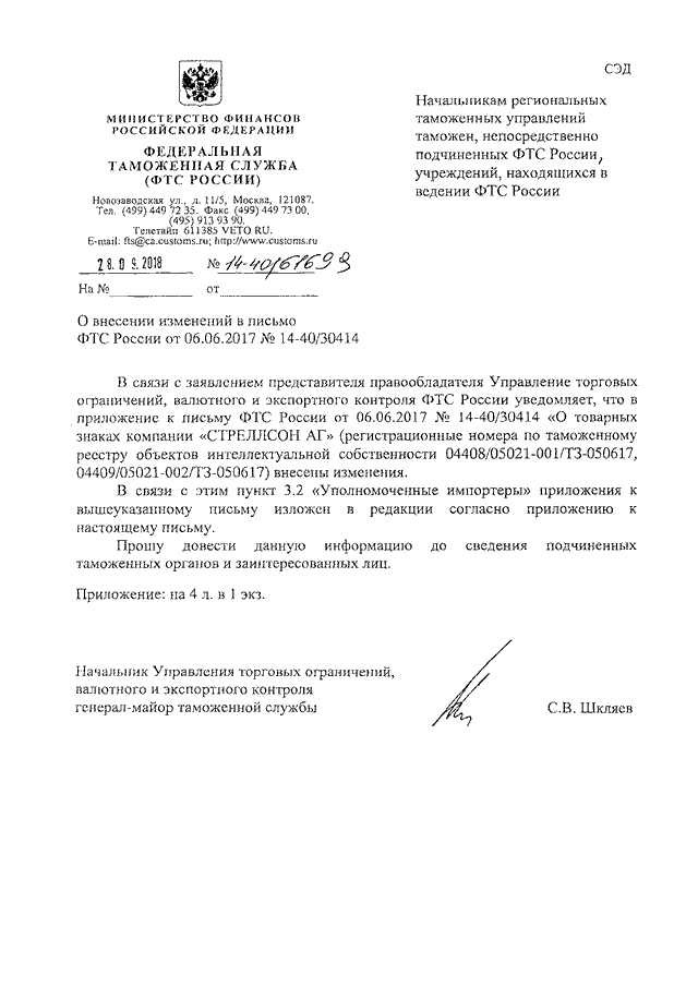 "О ВНЕСЕНИИ ИЗМЕНЕНИЙ В ПИСЬМО ФТС РОССИИ ОТ 06.06.2017 N 14-40/30414"