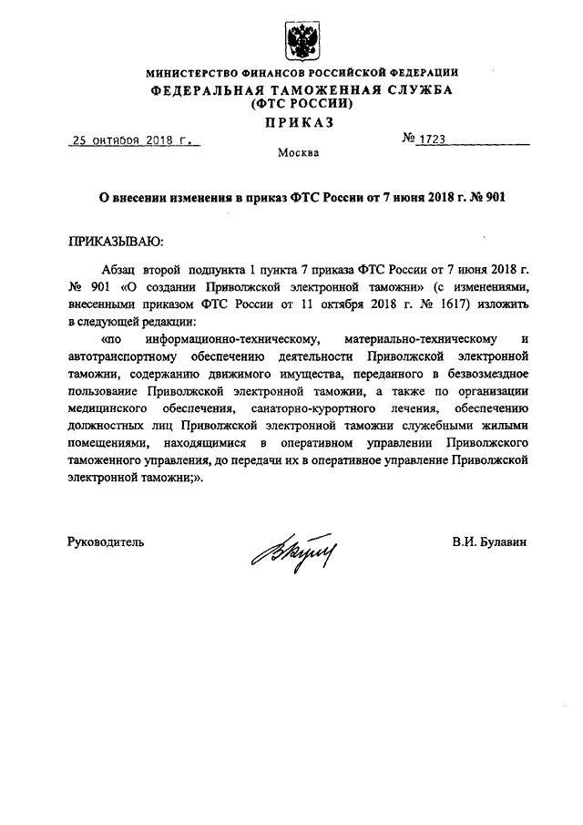 ПРИКАЗ ФТС РФ от 25.10.2018 N 1723