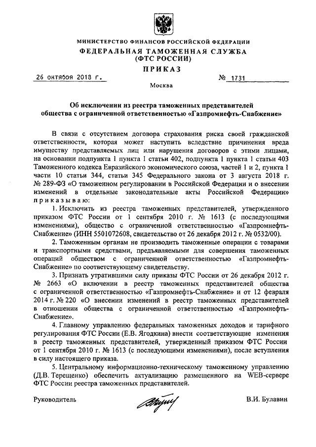ПРИКАЗ ФТС РФ от 26.10.2018 N 1731