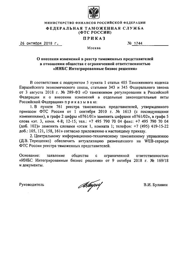 ПРИКАЗ ФТС РФ от 26.10.2018 N 1744