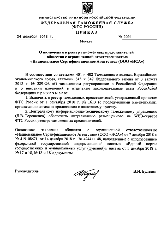 ПРИКАЗ ФТС РФ от 24.12.2018 N 2091