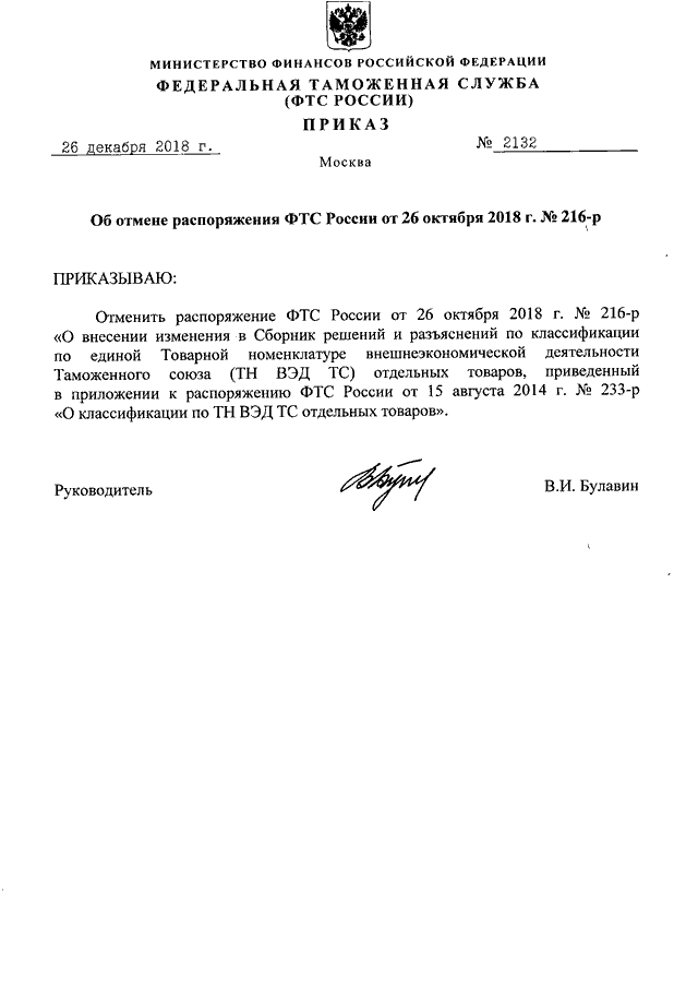 "ОБ ОТМЕНЕ РАСПОРЯЖЕНИЯ ФТС РОССИИ ОТ 26 ОКТЯБРЯ 2018 Г. N 216-Р"
