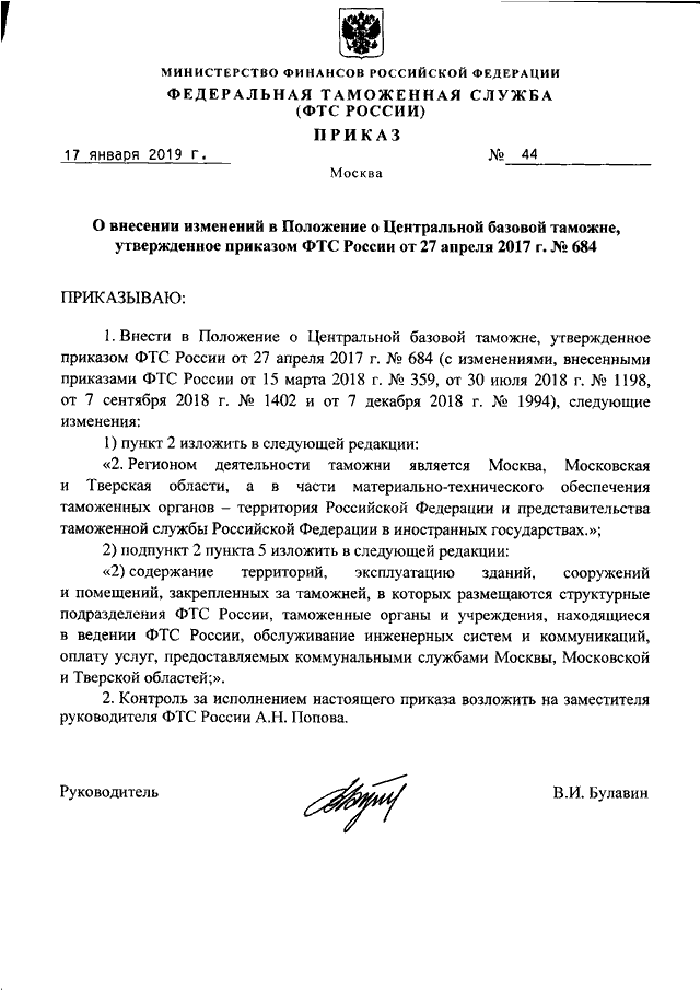ПРИКАЗ ФТС РФ от 17.01.2019 N 44