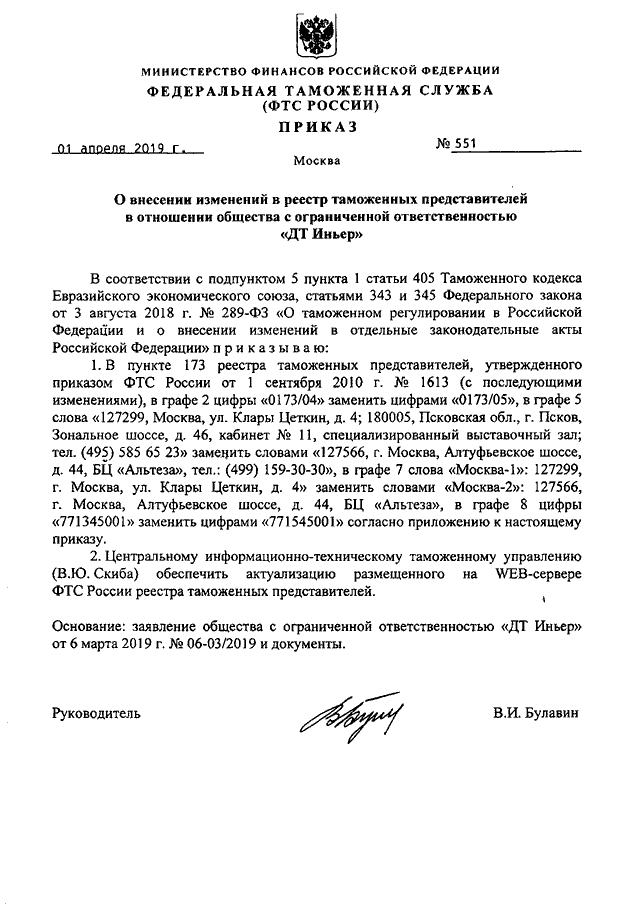 ПРИКАЗ ФТС РФ от 01.04.2019 N 551
