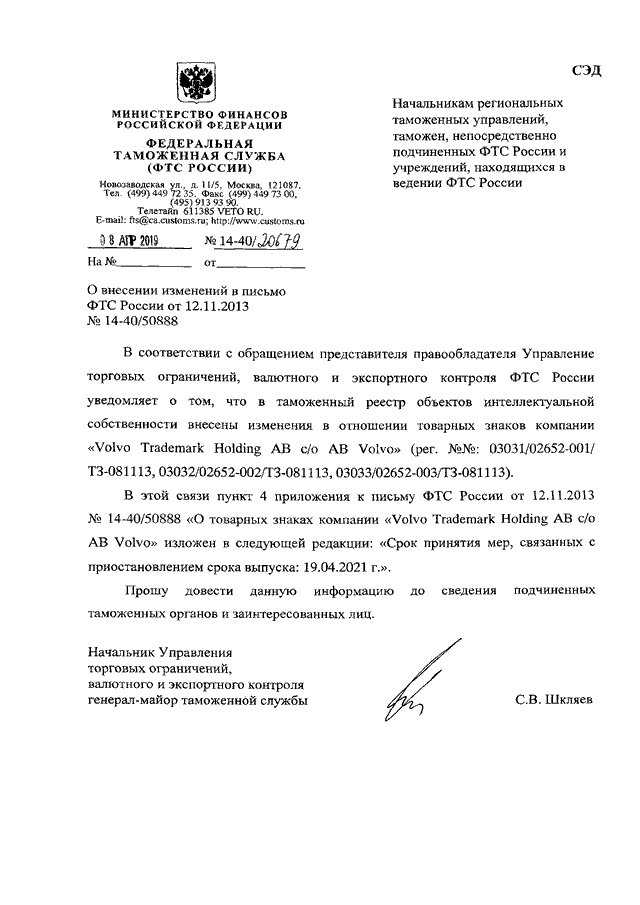 ПИСЬМО ФТС РФ от 08.04.2019 N 14-40/20679