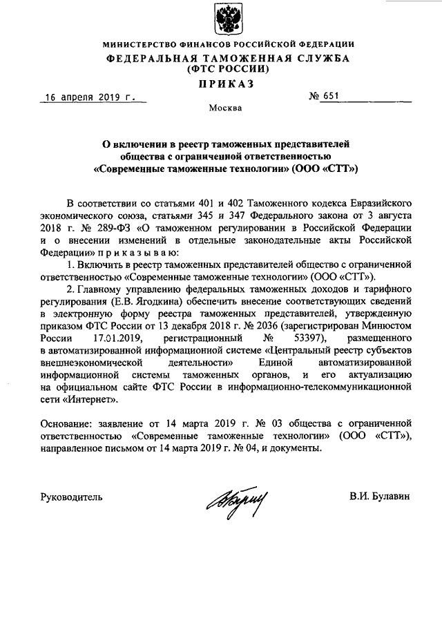 ПРИКАЗ ФТС РФ от 16.04.2019 N 651