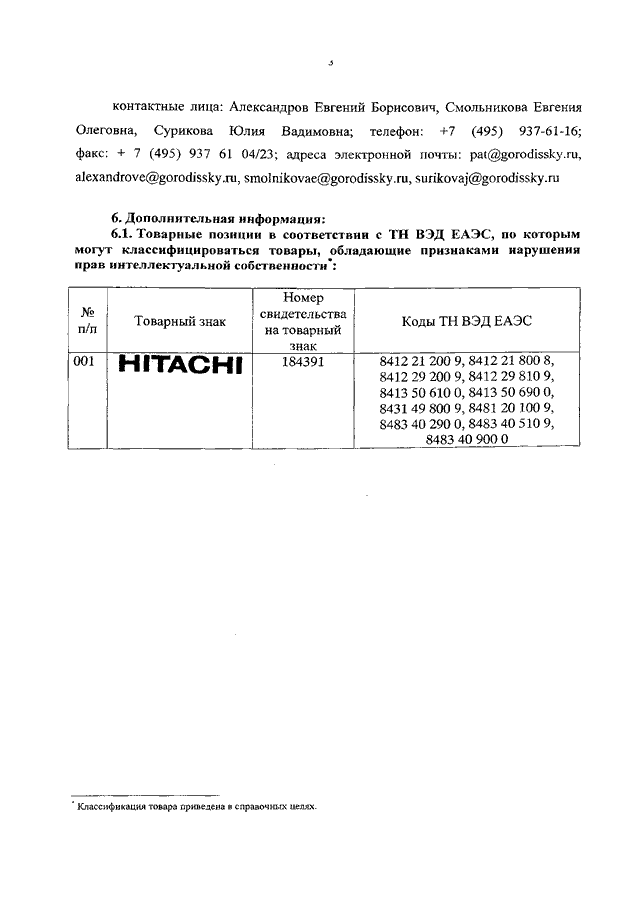 "О ТОВАРНОМ ЗНАКЕ "HITACHI" ПО СВИДЕТЕЛЬСТВУ О РЕГ. N 184391"