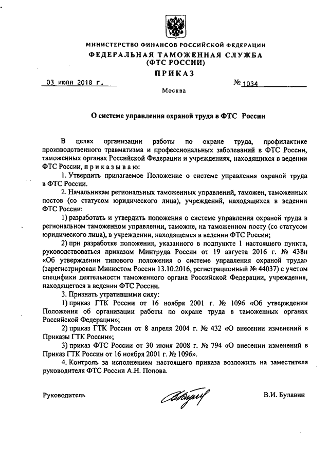 ПРИКАЗ ФТС РФ от 03.07.2018 N 1034