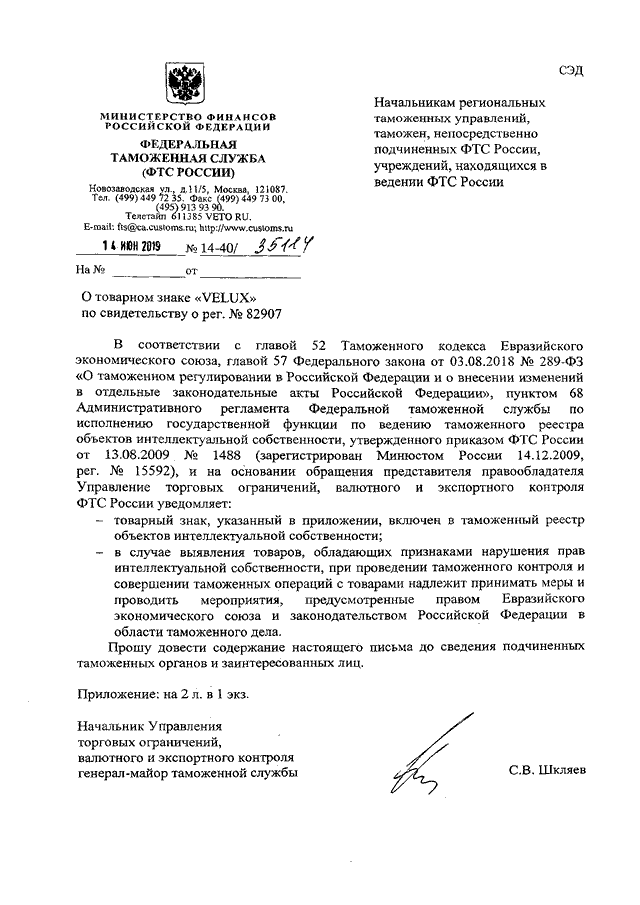 ПИСЬМО ФТС РФ от 14.06.2019 N 14-40/35114
