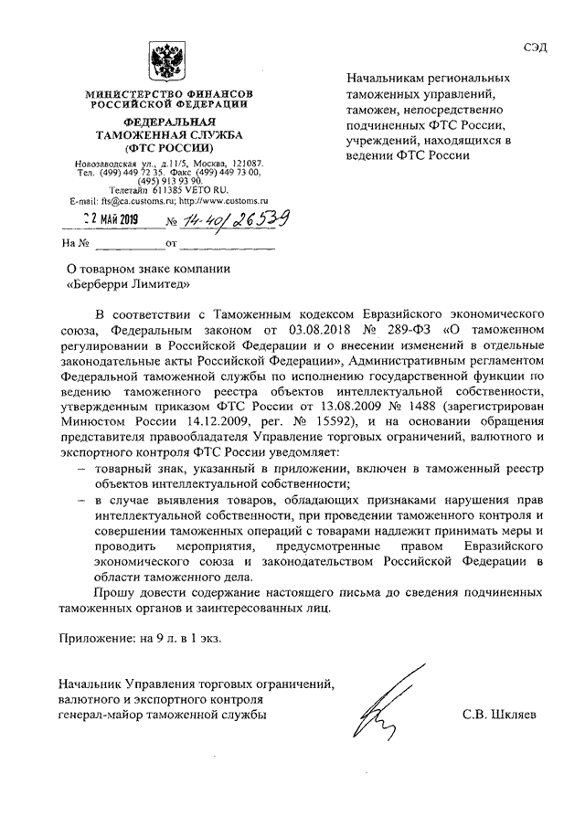 ПИСЬМО ФТС РФ от 22.05.2019 N 14-40/26539