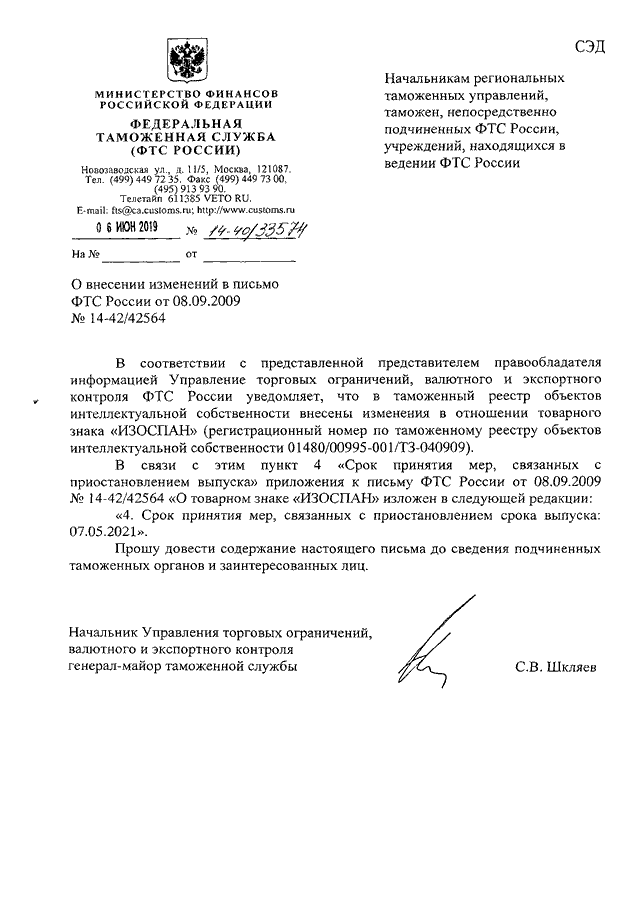 "О ВНЕСЕНИИ ИЗМЕНЕНИЙ В ПИСЬМО ФТС РОССИИ ОТ 08.09.2009 N 14-42/42564"
