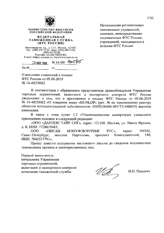 "О ВНЕСЕНИИ ИЗМЕНЕНИЙ В ПИСЬМО ФТС РОССИИ ОТ 05.06.2019 N 14-40/33062"