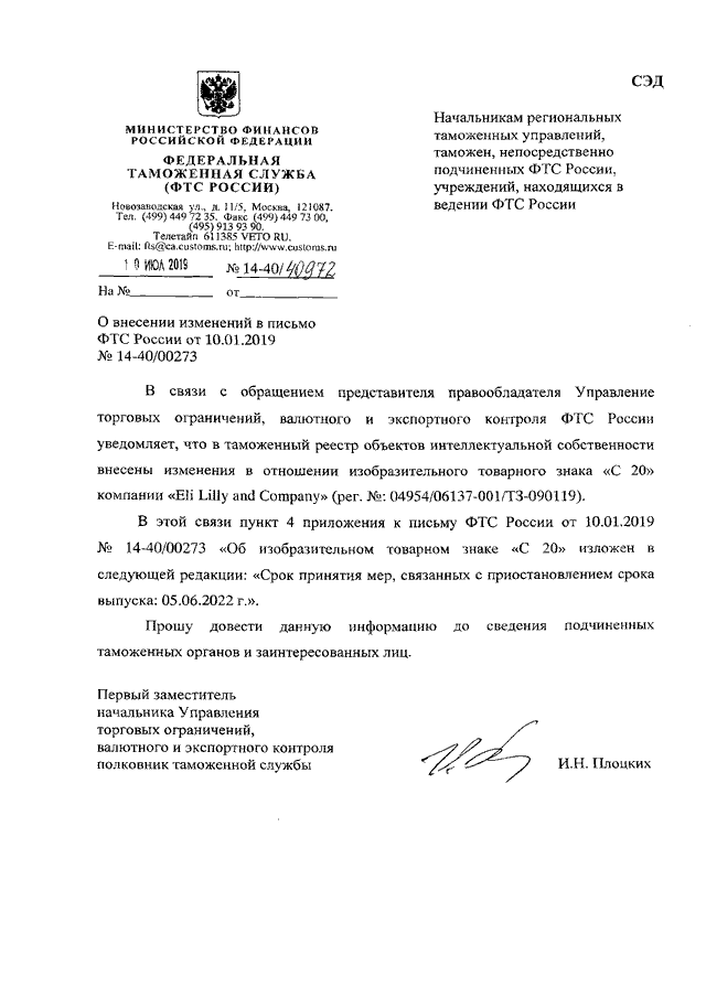"О ВНЕСЕНИИ ИЗМЕНЕНИЙ В ПИСЬМО ФТС РОССИИ ОТ 10.01.2019 N 14-40/00273"