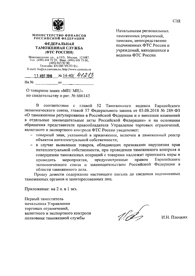 ПИСЬМО ФТС РФ от 11.07.2019 N 14-40/41213